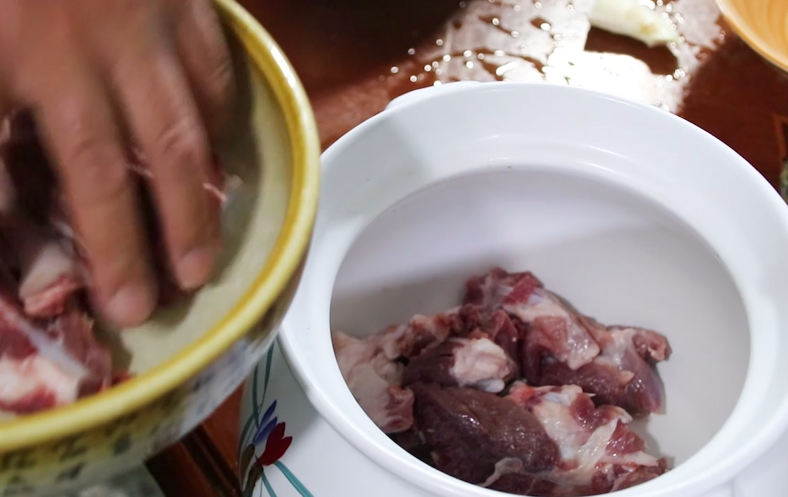 9、准备一个砂锅,可能大家都认为还要转砂锅太麻烦了,但用砂锅炖出来的口感是菜锅和电饭锅都比不了的,为了美味麻烦一点也是值得的,好了,再把筒骨放在砂锅底下。